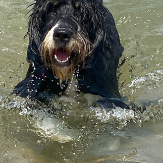 Afterwards, we decided to conclude the day with some time at the beach. It was a bittersweet moment when we found front row parking at a stunning beach, only to realize we had forgotten our bathing suits, ugh. Pearl eagerly jumped out of the bus—with permission, a behavior we've been working on—and enjoyed her time swimming while we stayed on the shore. A man who had been relaxing nearby went for a swim and enjoyed playing in the water with Pearl.